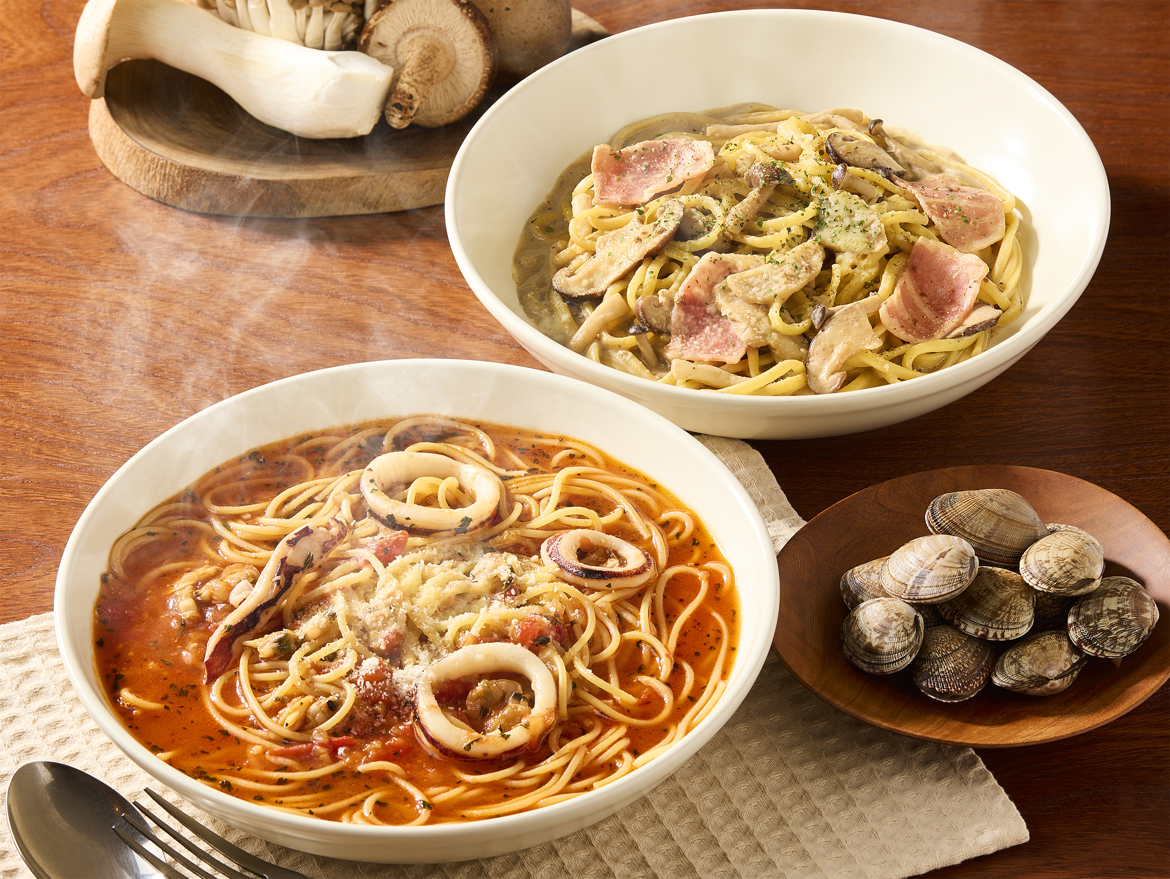 食欲の秋にPRONTOでは、“海の幸”感じる熱々スープの「海の幸のトマトバジル スープパスタ」と秋の味覚を楽しむ「3種のきのこと濃厚ポルチーニクリーム 生パスタ」の2種類のパスタが登場いたします!