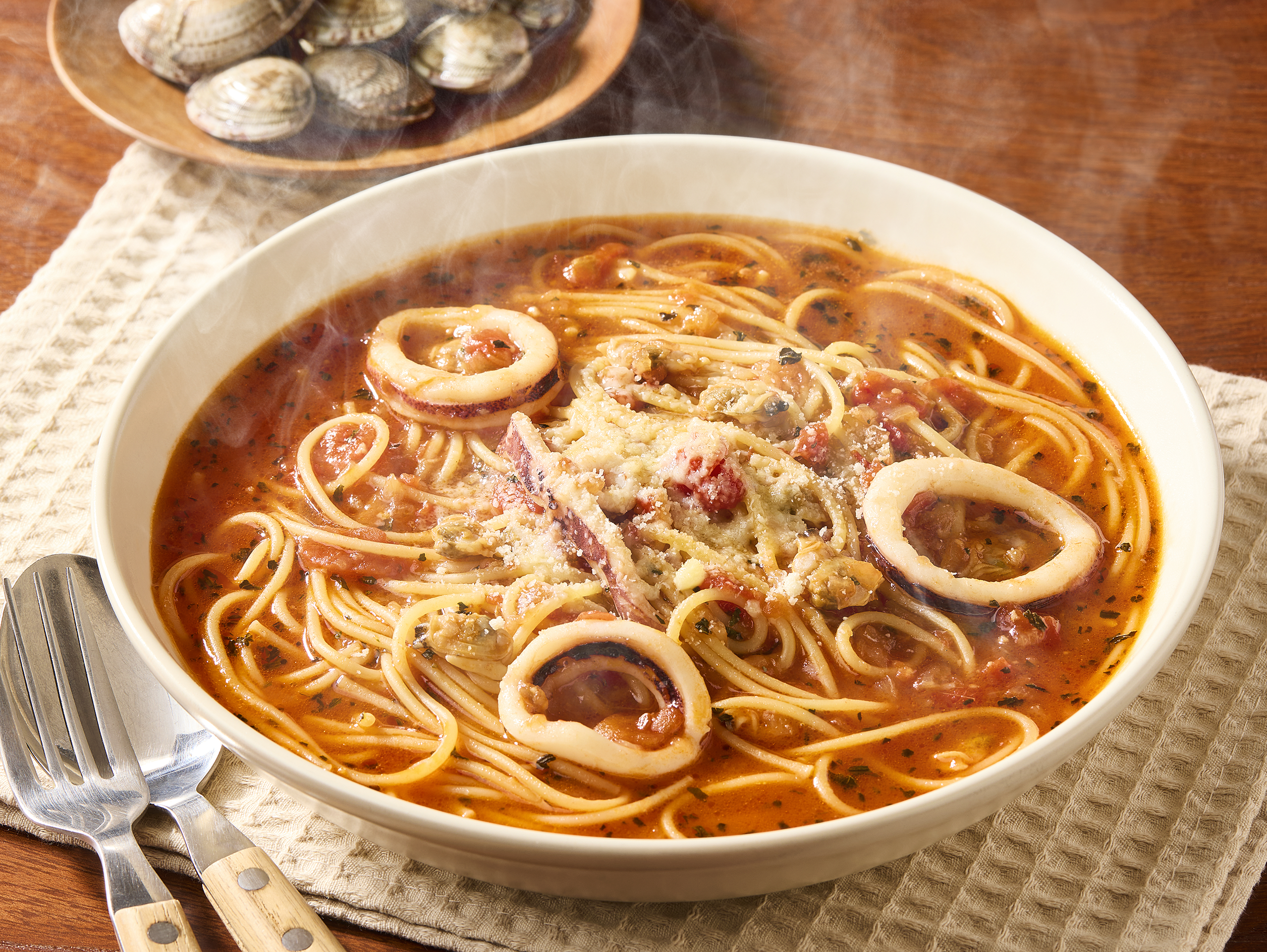 1,080円~(税込1,188円~)ガーリックとバジル、貝出汁の風味を効かせたトマトソースに、マツイカとあさりを加えたボリューム満点のスープパスタです。※テイクアウトには対応していません。