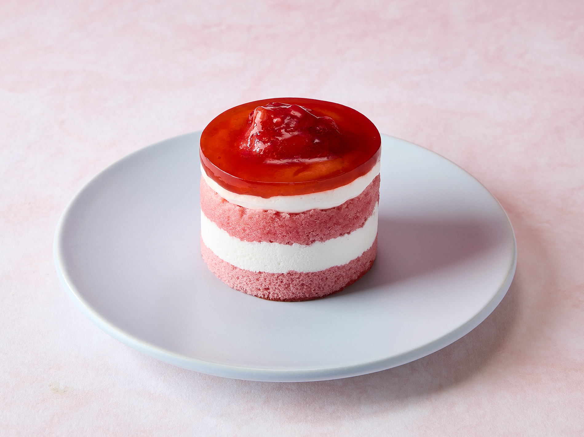 540円~(税込594円~)華やかなピンク色のスポンジに、口どけの良いマスカルポーネムースを重ね、天面にカット苺とソースをのせました。