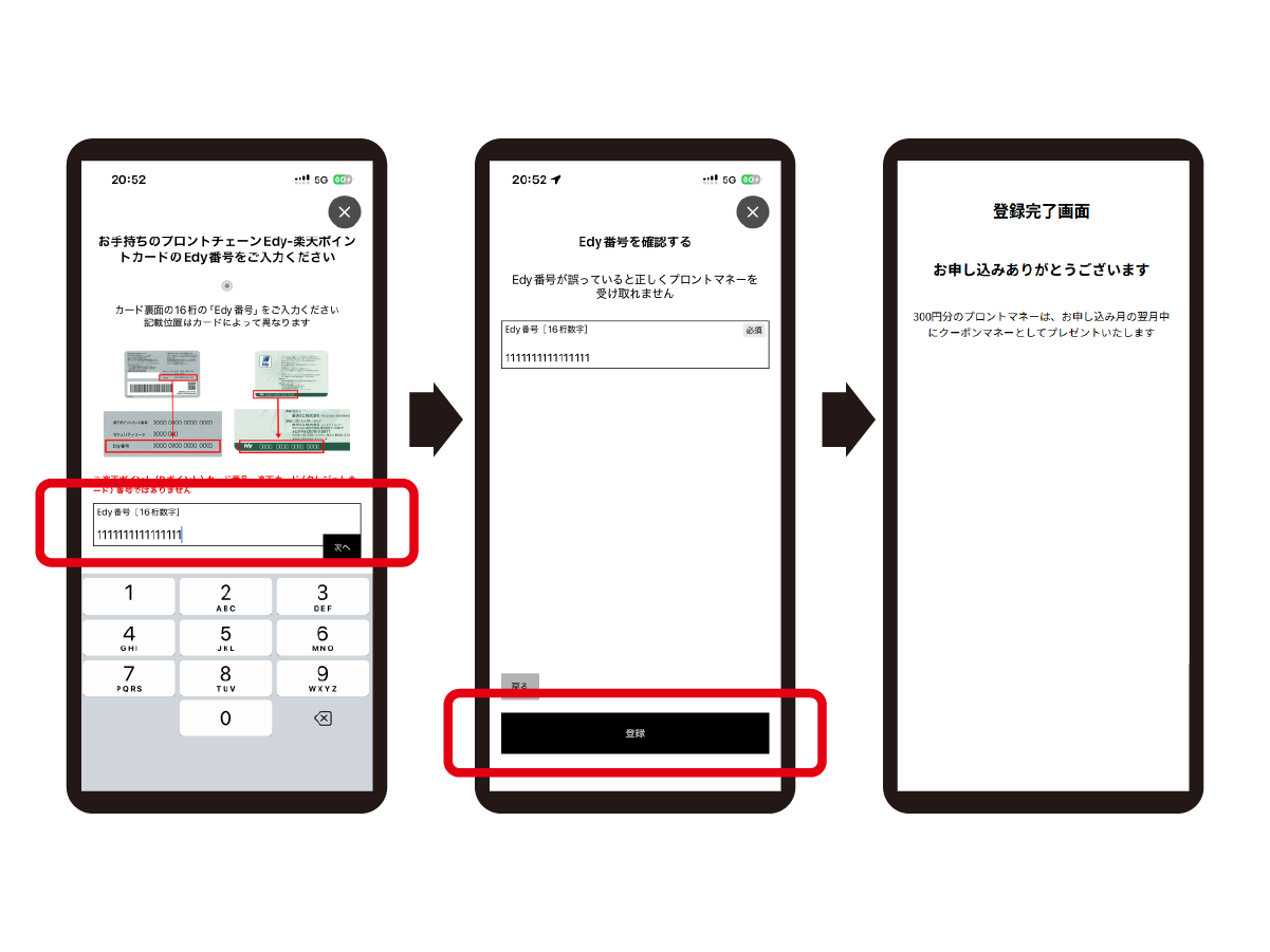 ・Edy番号が誤っていると、プロントマネーを正しく受け取れない場合がございます。