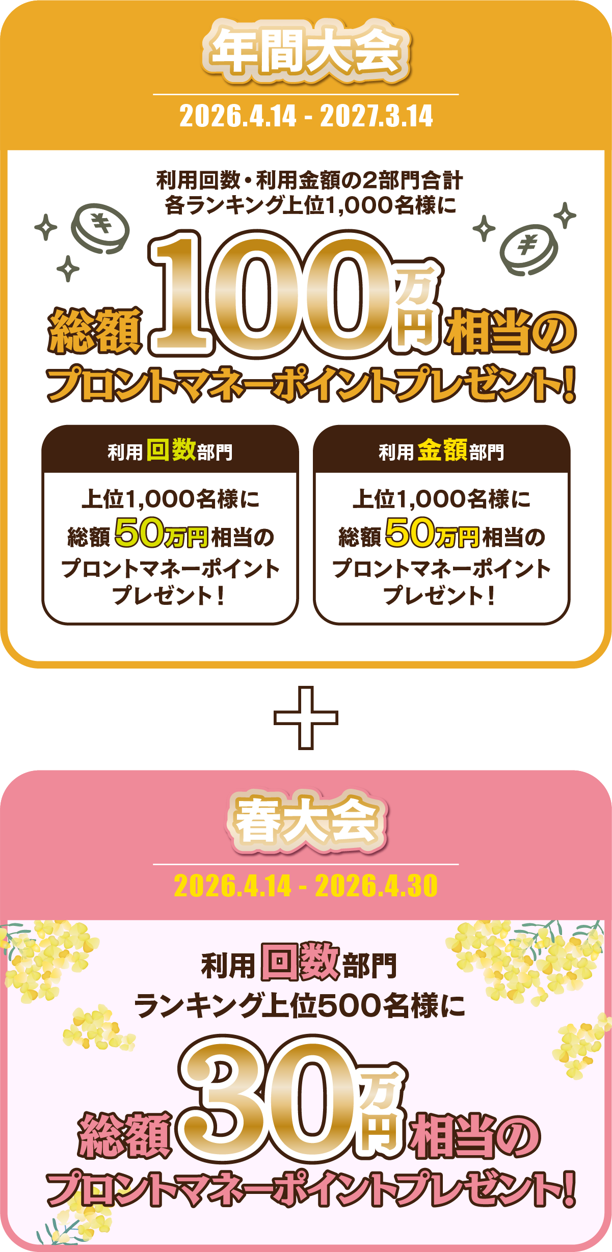 年間大会では、2026年4月14日~2027年3月14日の期間のプロントマネーの「ご利用回数」「ご利用金額」の2部門で実施します。あわせて、2026年4月14日から4月30日までの期間限定「春大会」では、ご利用回数に応じたランキング大会を開催します。