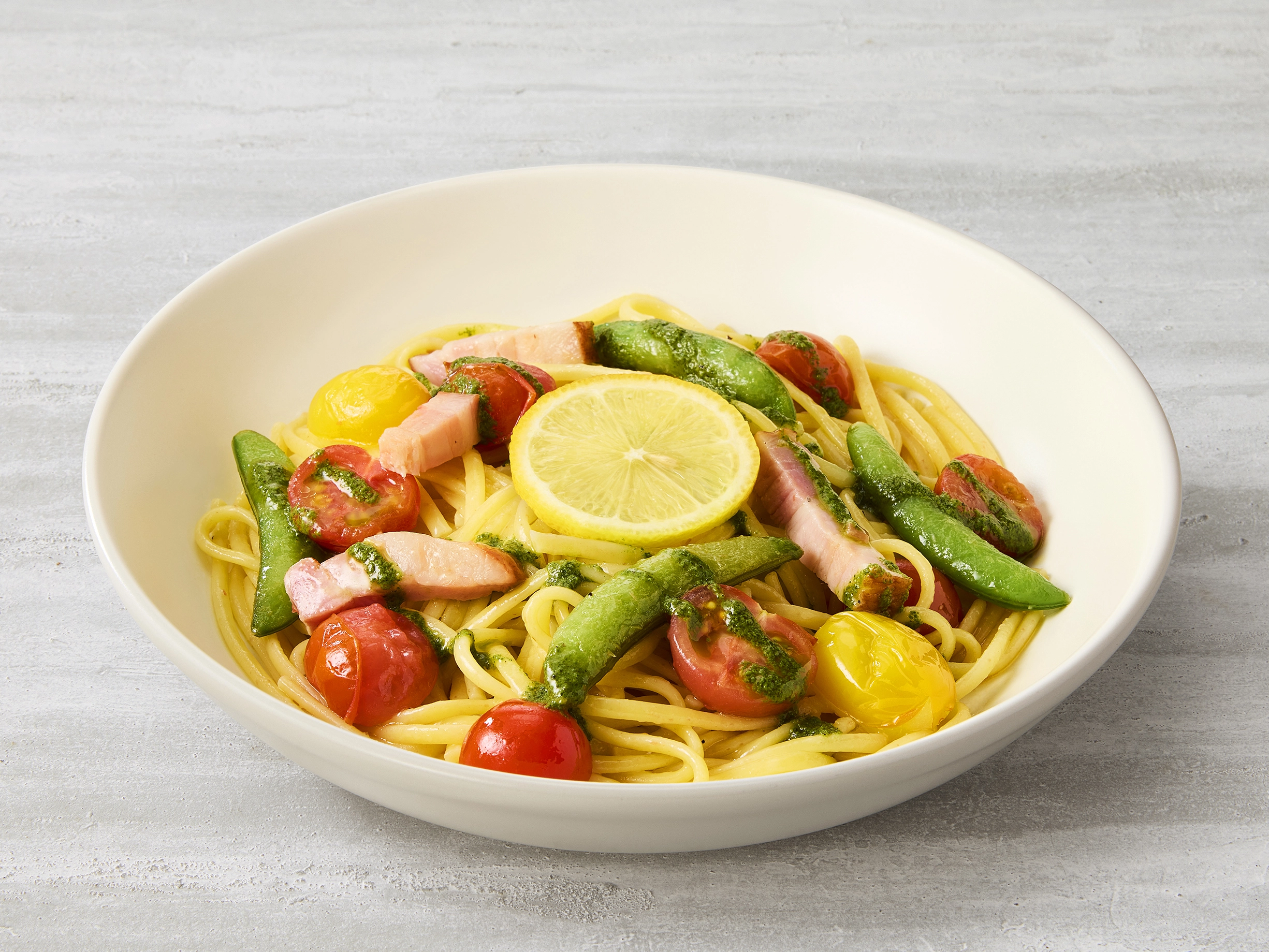 4月14日(火)より、野菜の彩りや食感、ホエー豚の旨味、バジルの香りが楽しめる「カラフル野菜と厚切ベーコンのレモンバジルソース 生パスタ」が季節限定で発売します。