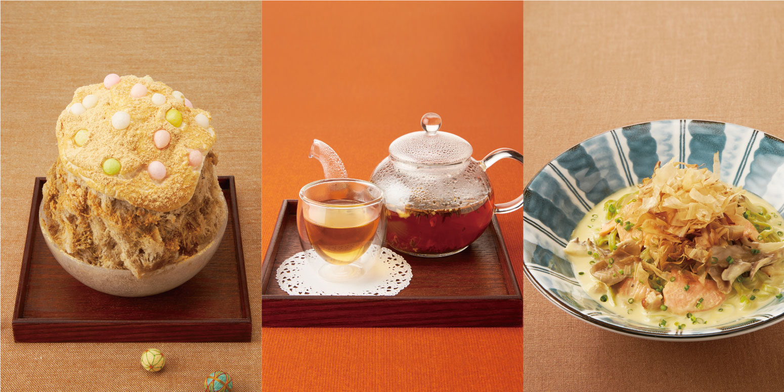 9月26日(水)より秋メニューが新登場いたしました。削り氷「ほうじ茶黒蜜クリーム〜わらび餅入り〜」は好評につき再登場のメニュー!”おいり”がトッピングできるので、よりかわいさがアップ。ぜひお試しください!その他、鯛出汁を効かせた新感覚のカルボナーラや、丼ぶりからはみ出す穴子が豪快なお膳など幅広くご用意しております!是非、Tsumugiこだわりの秋メニューをお楽しみください。