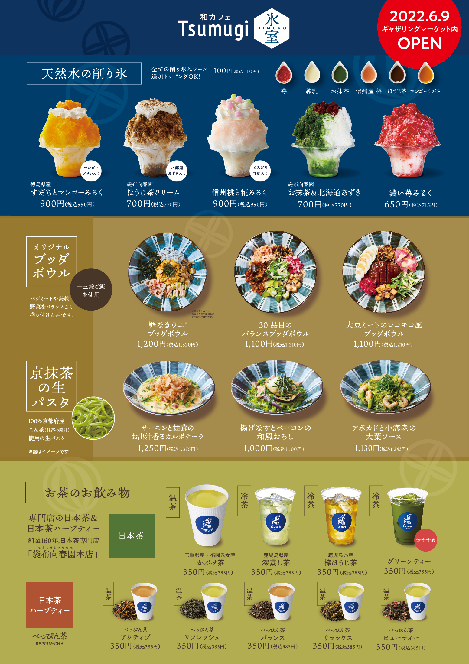「和カフェ Tsumugi 氷室」は、6月9日(木)からの期間限定店舗で、暑い夏にぴったりの「天然水の削り氷」を中心に、ツムギの名物である「ブッダボウル」等、お持ち帰り専用メニューも多数ご用意し、お客様の幅広い利用同期に対応できる季節限定のサテライトショップです。