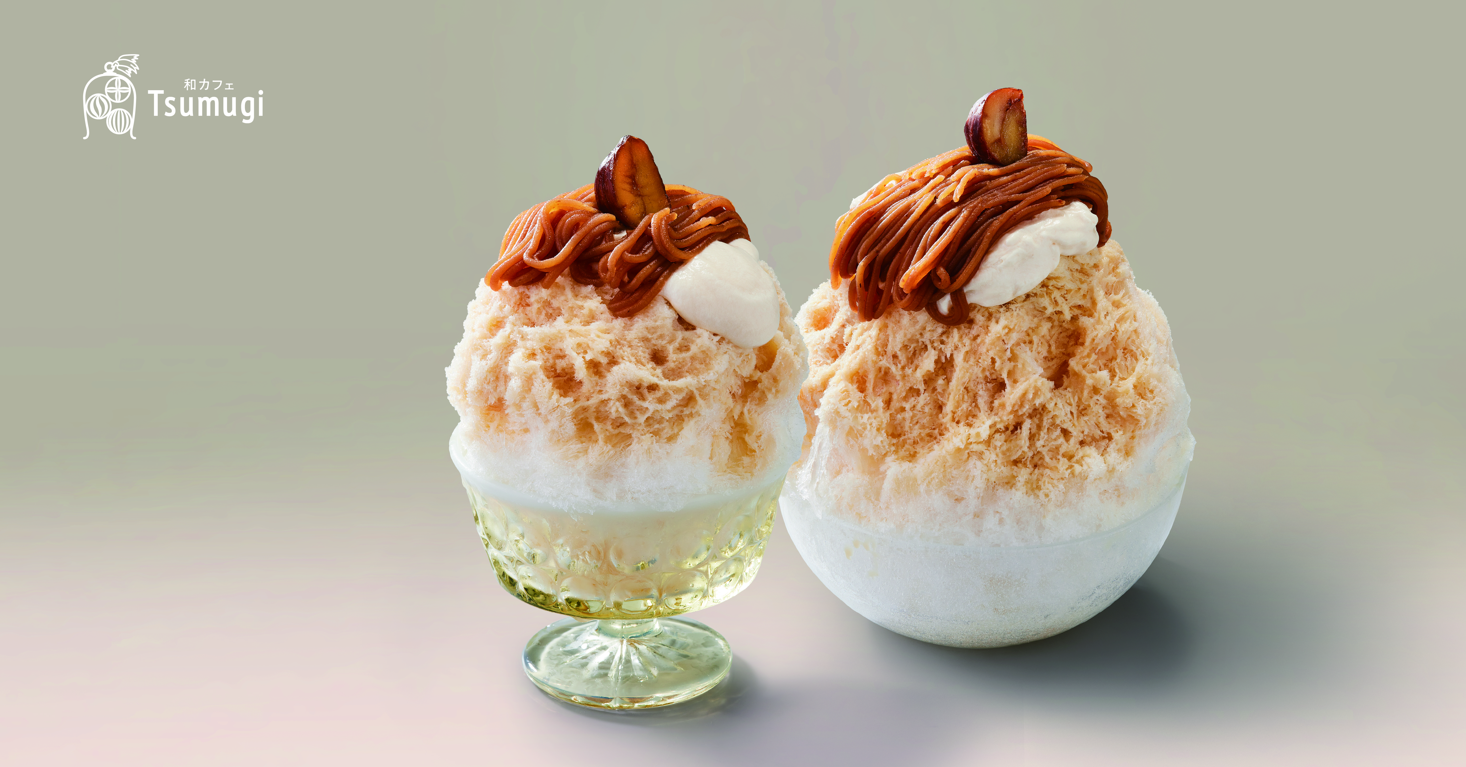 ツムギに秋季限定の「天然水の削り氷 モンブラン」が新登場!極薄に削りふわふわに仕上げた「天然水の削り氷」に、ラム酒風味に香りづけしたマロンシロップ※1をかけ、マロンクリームと濃厚なモンブランクリーム、栗の渋皮煮をトッピングしました。濃厚な栗の風味と、ラム酒風味の芳醇な香りをお楽しみいただける、秋の削り氷をぜひご堪能ください。※1マロンシロップはアルコール不使用です。